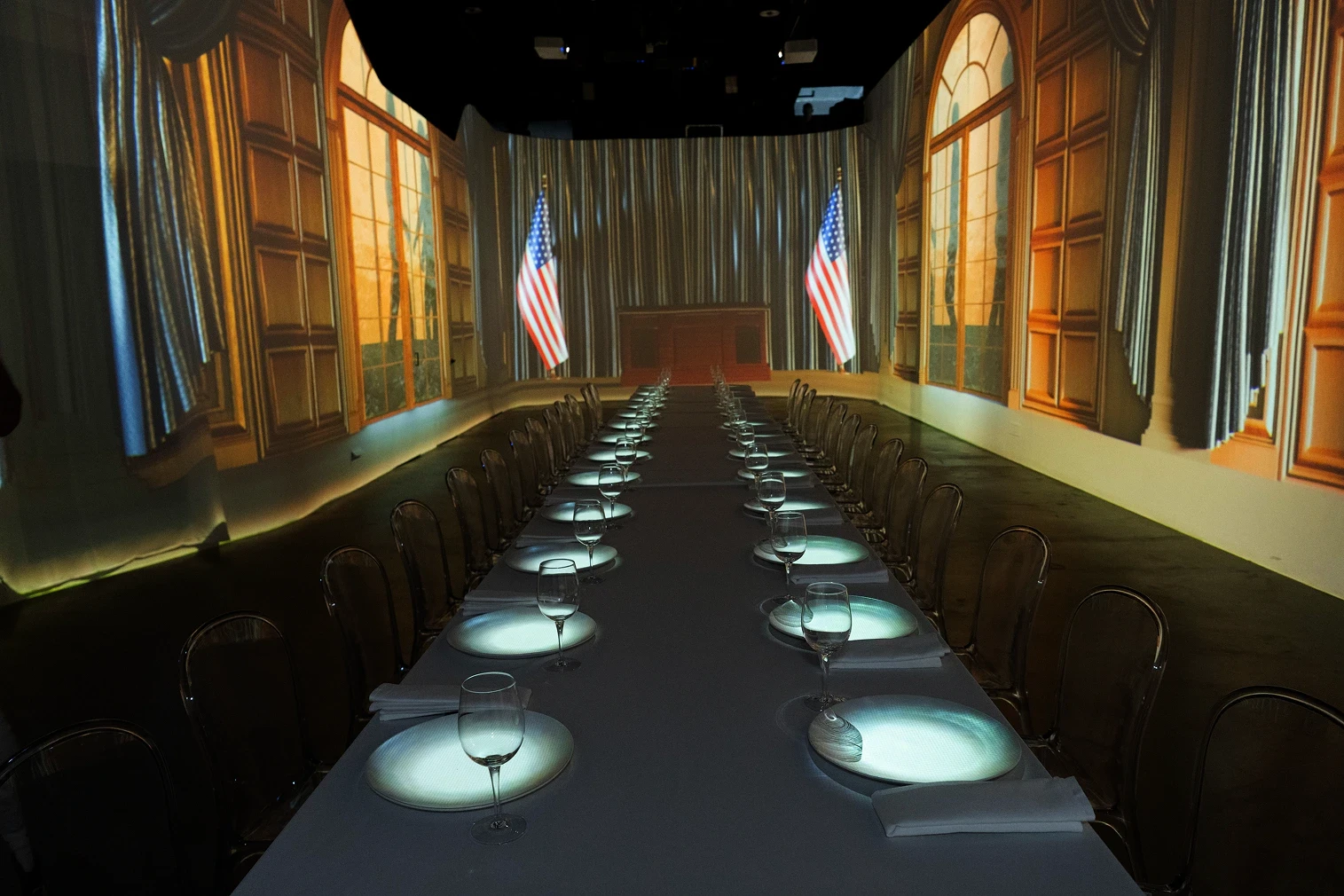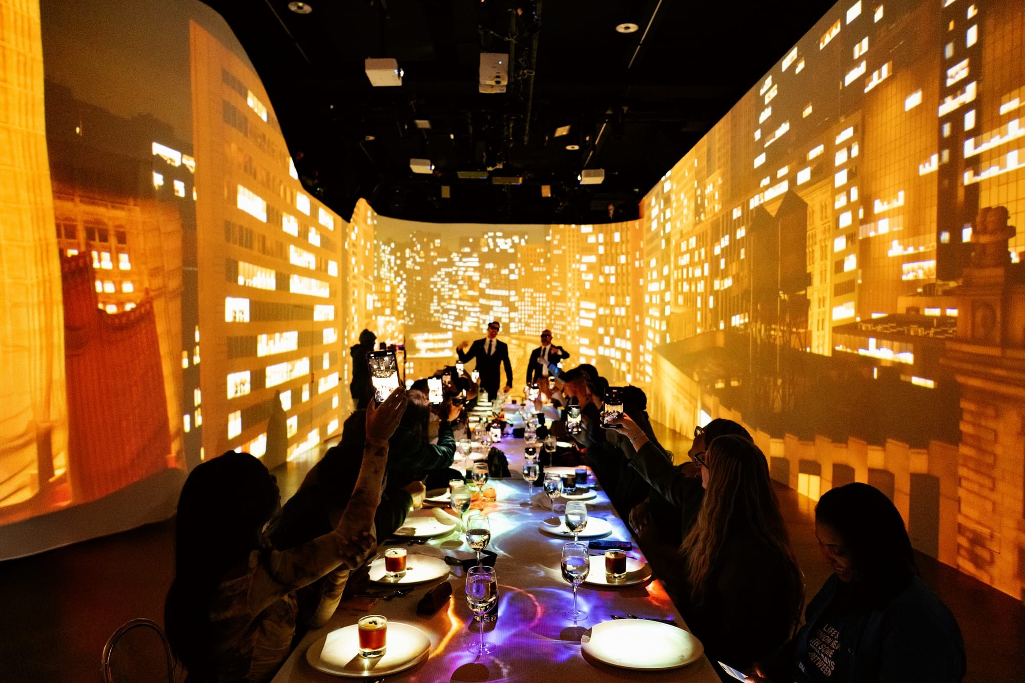 Our team designs custom 360° projection content that transforms the space around your guests. Visuals can shift between courses, creating a multi-chapter dining journey.